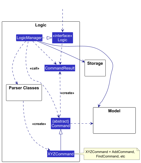 XYZCommandParserclasses (e.g.,AddCommandParser,DeleteCommandParser, …) inherit from theParserinterface so that they can be treated similarly where possible e.g. during testing. - All